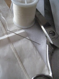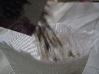 Ich schnitt weißen, sehr dünnen Baumwollstoff zu. Als Länge berechnete ich 16,5 cm und als Breite 11,5 cm. Ich nahm einen richtigen Teebeutel auseinander und stellte fest, dass es eigentlich nur ein Schlauch ist.