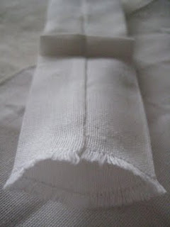 Also nähte ich die langen Seiten zusammen. Ich hatte meine Nähmaschine im Malstudio vergessen und mußte daher von Hand nähen. Anschließend bügelte ich den Schlauch, aber so, dass die Naht so saß, wie auf dem Foto unten. Dann faltete ich den Schlauch zur Mitte und bügelte eine Falte hinein.