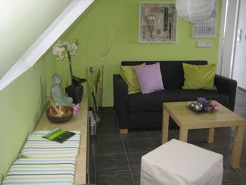 Auch im Loungebereich ist etwas von der Fliederfarbe eingezogen.