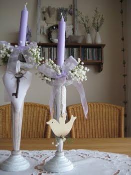 Mit lila Organzaschleifen und den passenden Kerzen sieht das