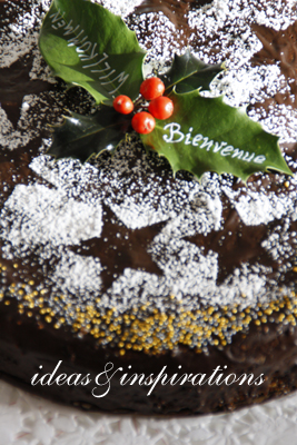 Ich habe eine Variation mit Puderzucker und Zuckerperlen gewählt. Sie gefällt mir auch ganz gut. Als Clou habe ich einen Willkommensgruß mit einem weißen Lackstift auf die Ilexblätter geschrieben.