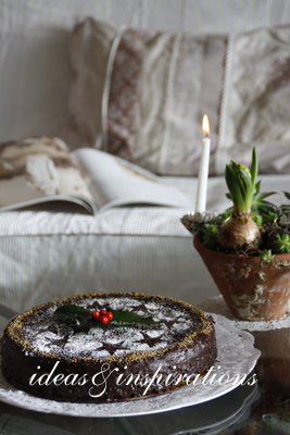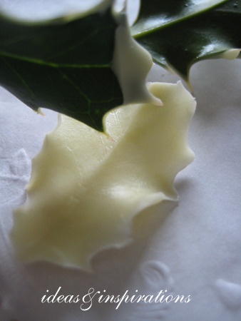 Für unseren Besuch aus Frankreich habe ich einen Mohnkuchen gebacken. Der Kuchen sollte mit einer Schokoglasur überzogen werden. Das war mir zu langweilig und so überzog ich außerdem noch drei Ilexblätter mit weißer Kuvertüre.