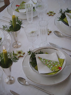 Vorgestern bin ich herum gefahren und habe die passenden Zutaten eingekauft. Grüne Kerzen, Servietten, Fotokarton und Draht. Anschließend habe ich die Tischkarten zugeschnitten und verklebt. Allerdings habe ich verschieden farbige Bäumchen gebastelt ....das gefiel mir noch besser.