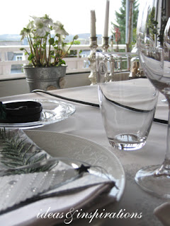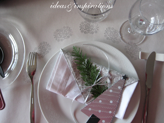 Die Tischdecke (Dunicel Tischtuchrolle) habe ich am Morgen noch mit Stempelaufdrucken in Silber aufgestylt. Das Messerbänkchen ist eigendlich für asiatische Stäbchen gedacht, doch ich habe es umfunktioniert, weil man nie weiß, wo man sein Messer ablegen soll.