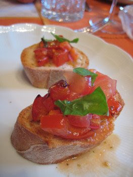 "Pagnotta a mezzo di pomodori pelati stand auf der Speisekarte, was soviel hießt wie Bruchetta.